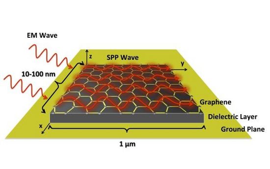 當(dāng)石墨烯中的電子被傳輸來的電磁波激發(fā)時,會發(fā)生 Akyildiz 教授提到的“奇特的傳播”。這種情況下,電子開始來回運動,創(chuàng)造電荷振蕩,結(jié)果在石墨烯的表面上產(chǎn)生了密閉的電磁波。這種現(xiàn)象就是人們熟知的表面等離子體激元(SPP)波,這使基于石墨烯的納米天線在太赫茲頻率范圍內(nèi)運作成為可能,這個范圍在 0.1 到 10 太赫茲之間。而像金這樣的金屬也能產(chǎn)生 SPP,但是它們只能在更高的頻率中才能做到。
